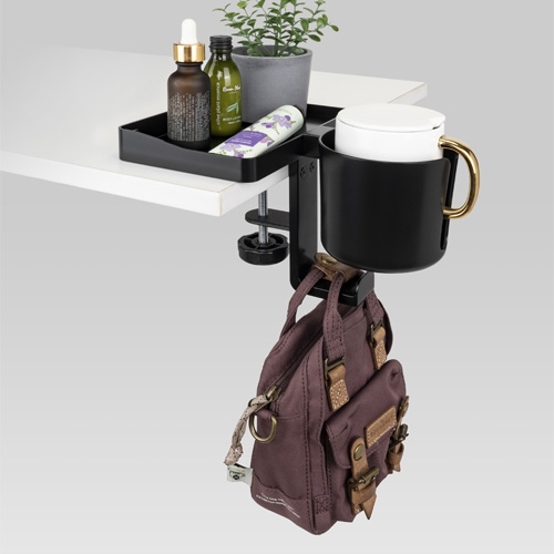 Incluyegancho para auriculares, bolsos, carteras, etc. Abrazadera de metal resistente que se adapta a escritorios de hasta 55 mm. Sostiene vasos y tazones o diversos artículos de papelería. Espacio para papel de notas.