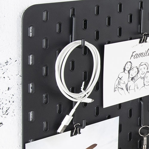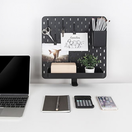 Incluye una cesta de almacenamiento, una bandeja y 4 ganchos para colgar que puedes orientar como prefieras en la pizarra